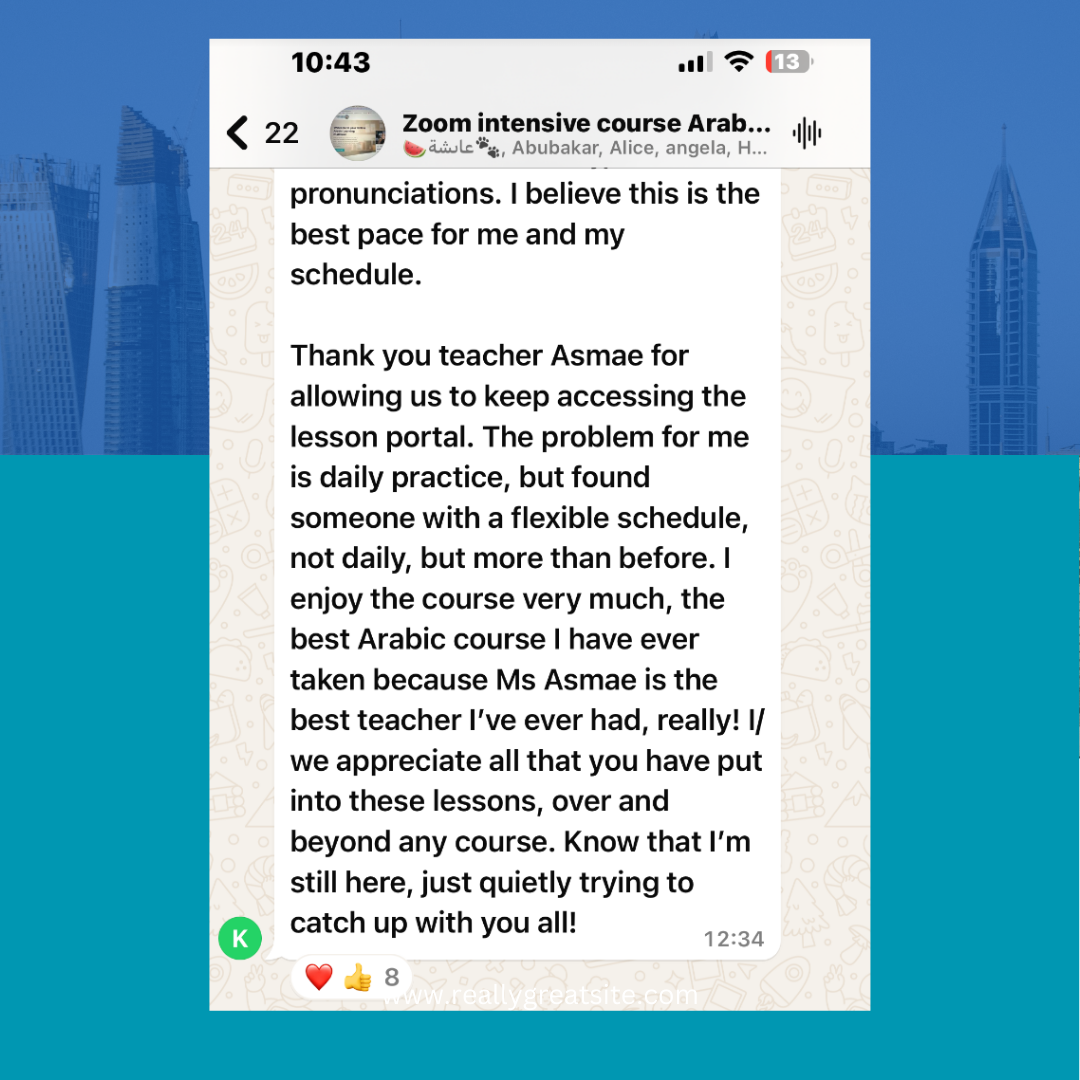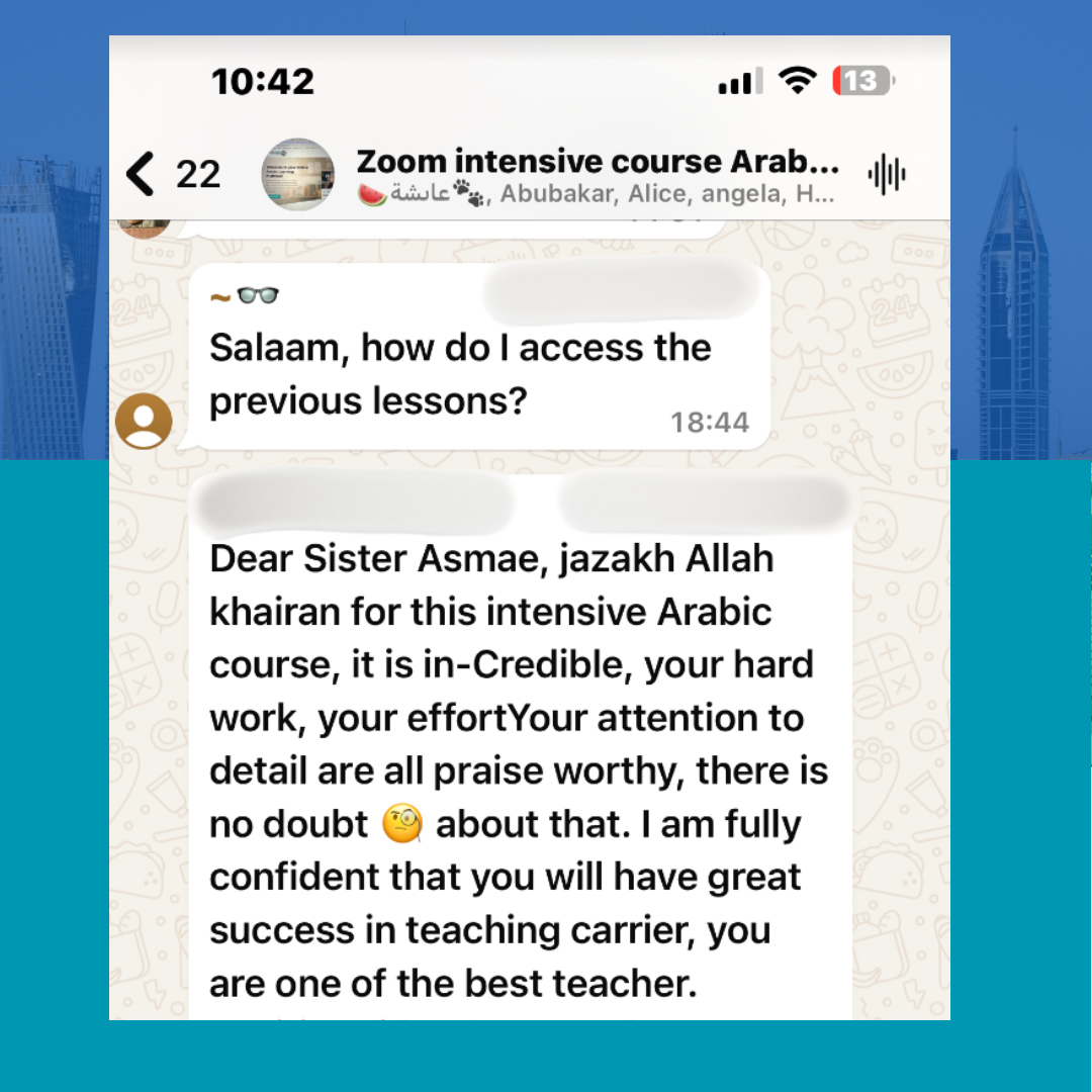 Asmae’s Arabic Intensive Course is designed for beginners and intermediate learners who want to build a solid foundation in the Arabic language. Over three months, the course combines engaging live sessions with recorded lessons, providing flexibility for students to learn at their own pace.